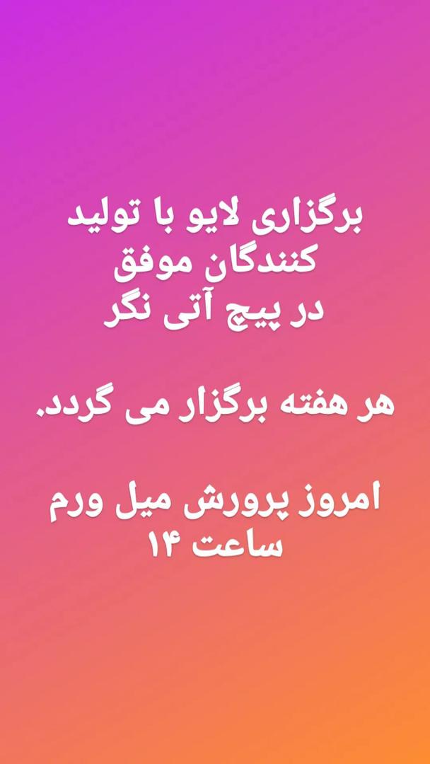 از این پس هر هفته با تولید کنندگان موفق در همه ی دوره های آموزشی لایو زنده خواهیم داشت پس دوستانی که تمایل دارند حتما پیج ما رو فالو کنن و از این فرصت جهت پرسش و پاسخ های مختلف استفاده کنند آدرس پیج: